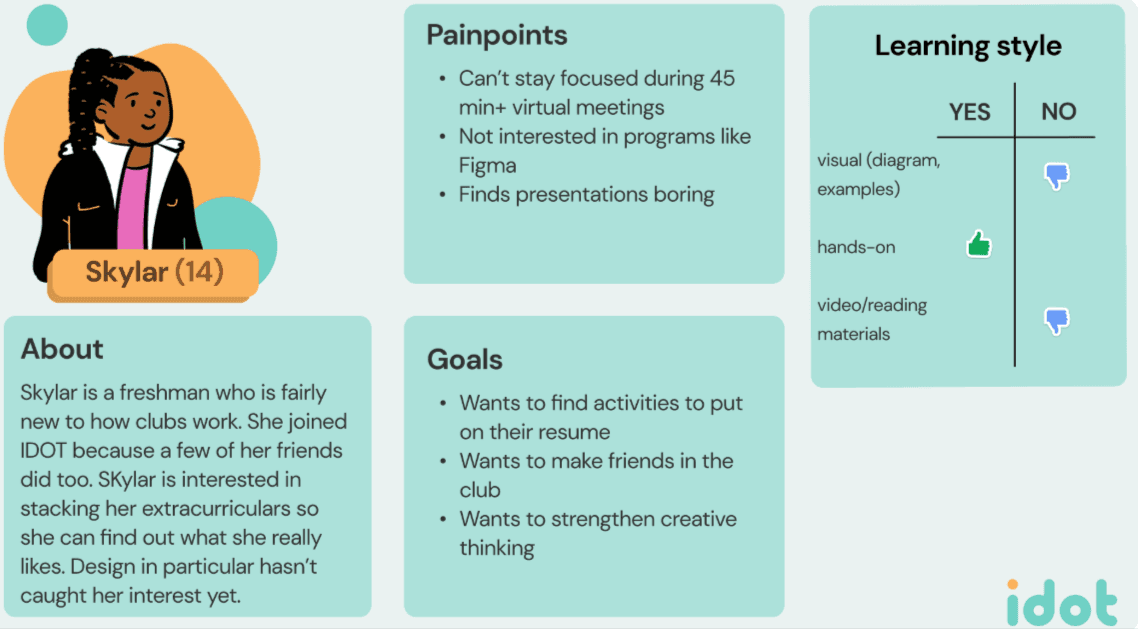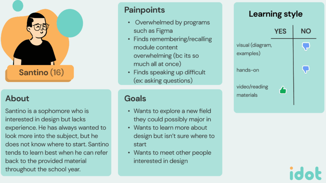 Innovative Designers of Tomorrow (IDOT) is an organization focused on bringing design education to American classrooms. With evolving learning models and standards, my team and I sought out to find the most effective, innovative approaches to teach design.
