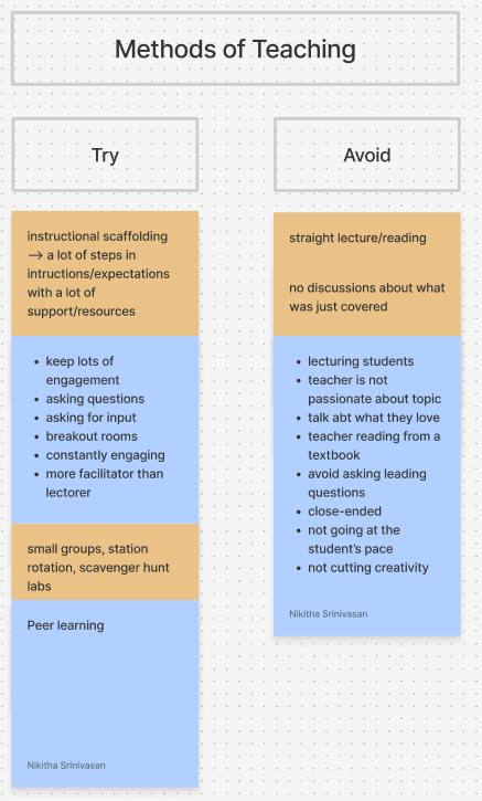 Affinity mapping was used to generate and consolidate ideas. Our key insights focused on increasing kinesthetic learning and collaboration within classrooms. Here is one example of findings on teaching methods: